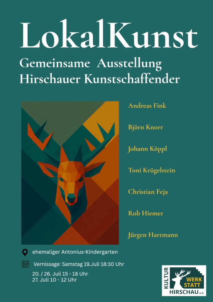 Im Juli 2025 veranstaltete die Kulturwerkstatt Hirschau im ehemaligen Antonius-Kindergarten die Ausstellung „LokalKunst“. Insgesamt zehn Künstlerinnen und Künstler aus Hirschau präsentierten bei einer gemeinsamen Vernissage ihre Werke. Die Ausstellung zeigte die große Bandbreite der lokalen Kunstszene – von Malerei und Holzarbeiten über Fotografien bis hin zu experimentellen Drucken mit Fotonegativen sowie Naturarbeiten und Mangas.